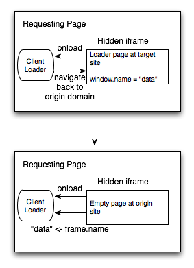 name 在浏览器环境中是一个全局/window对象的属性,且当在 frame 中加载新页面时,name 的属性值依旧保持不变。通过在 iframe 中加载一个资源,该目标页面将设置 frame 的 name 属性。此 name 属性值可被获取到,以访问 Web 服务发送的信息。但 name 属性仅对相同域名的 frame 可访问。这意味着为了访问 name 属性,当远程 Web 服务页面被加载后,必须导航 frame 回到原始域。同源策略依旧防止其他 frame 访问 name 属性。一旦 name 属性获得,销毁 frame 。