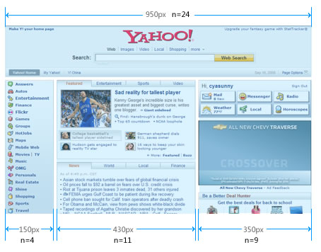 (A×n) - i = W这个公式表述了网页的布局与网页“背后”的栅格系统之间的某种关系。我们拿yahoo作例,来看一下栅格系统的应用: