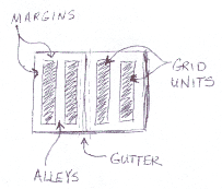 在你的页面版式中可能会设置有“Margin”(页边距)。在屏幕上这些边线可能会显示为浅色的实线或虚线。上、下、左、右的边线在你的页面中部形成了一个盒子。你将以此为基点,建立单元格。通过把页面均分为几个等份,来创建多个单元格。你可以创建可见的网格来辅助页面排版:你的页面排版软件有辅助线的功能,或者你可以在非打印层绘制边线或方块。通常你可以从页面旁的标尺上“拖拽”出一条辅助线,然后放置在需要的地方。