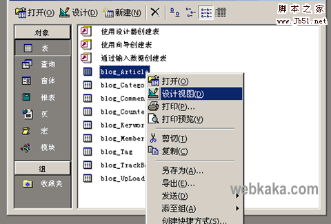 2、右键点击表名:blog_Article,然后点击菜单的“设计视图”