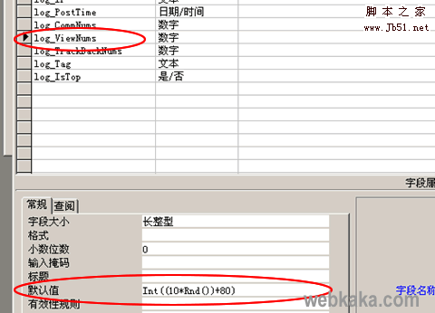 3、鼠标定位到“log_ViewNums”这个字段,然后把默认值修改为“Int((10*Rnd())+80)”(这个公式的结果是80-89之间的随机数字,你可以把80改为其他任意数字)